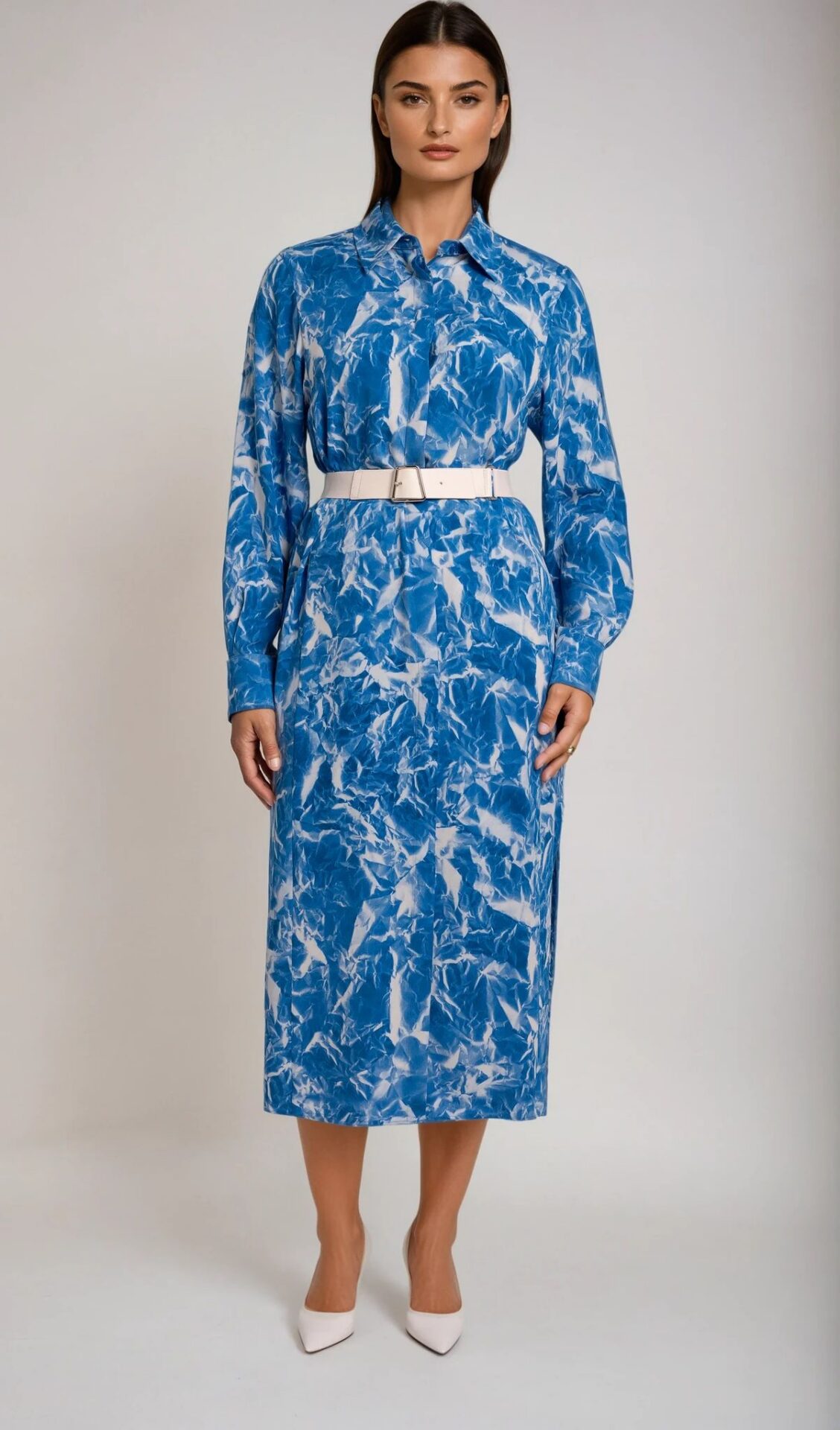 This shirt dress is crafted from 100% silk, pairing relaxed ease with a luxurious lightweight feel. The classic collar and concealed button placket create a clean, refined look, while the loose cut gently skims the body for maximum comfort. Its abstract all-over print lends a contemporary, artful character that turns the piece into a confident statement.