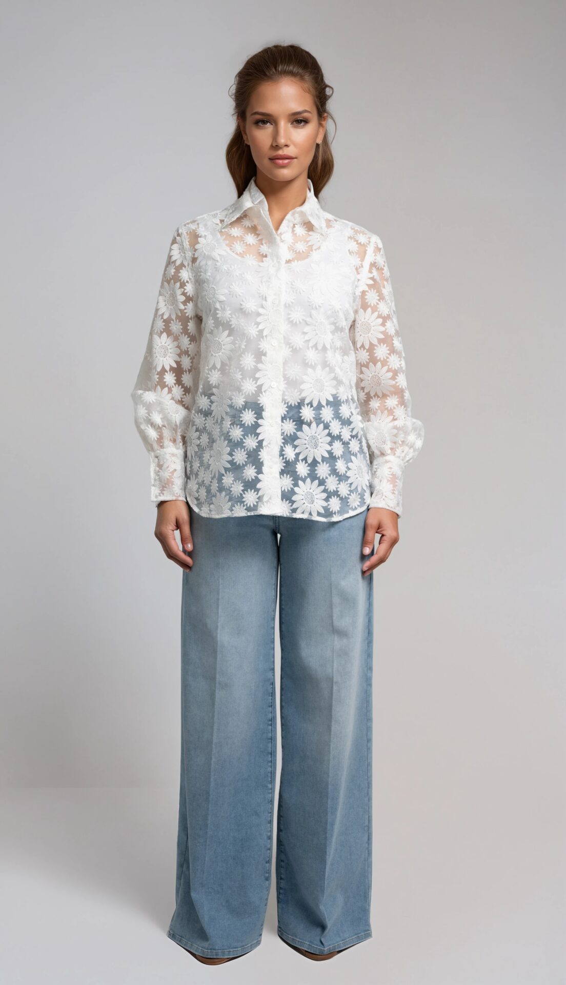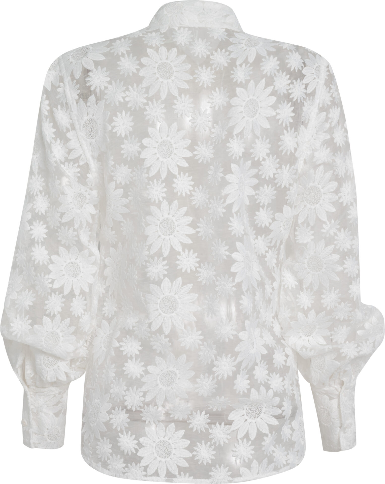 This blouse delivers luxurious lightness, elevating classic shirt details with a finely embroidered surface. The sheer fabric is covered in floral embroidery, creating an elegant modern look designed for sophisticated layering. A crisp collar and clean button front keep the silhouette polished, perfectly balancing the statement texture.