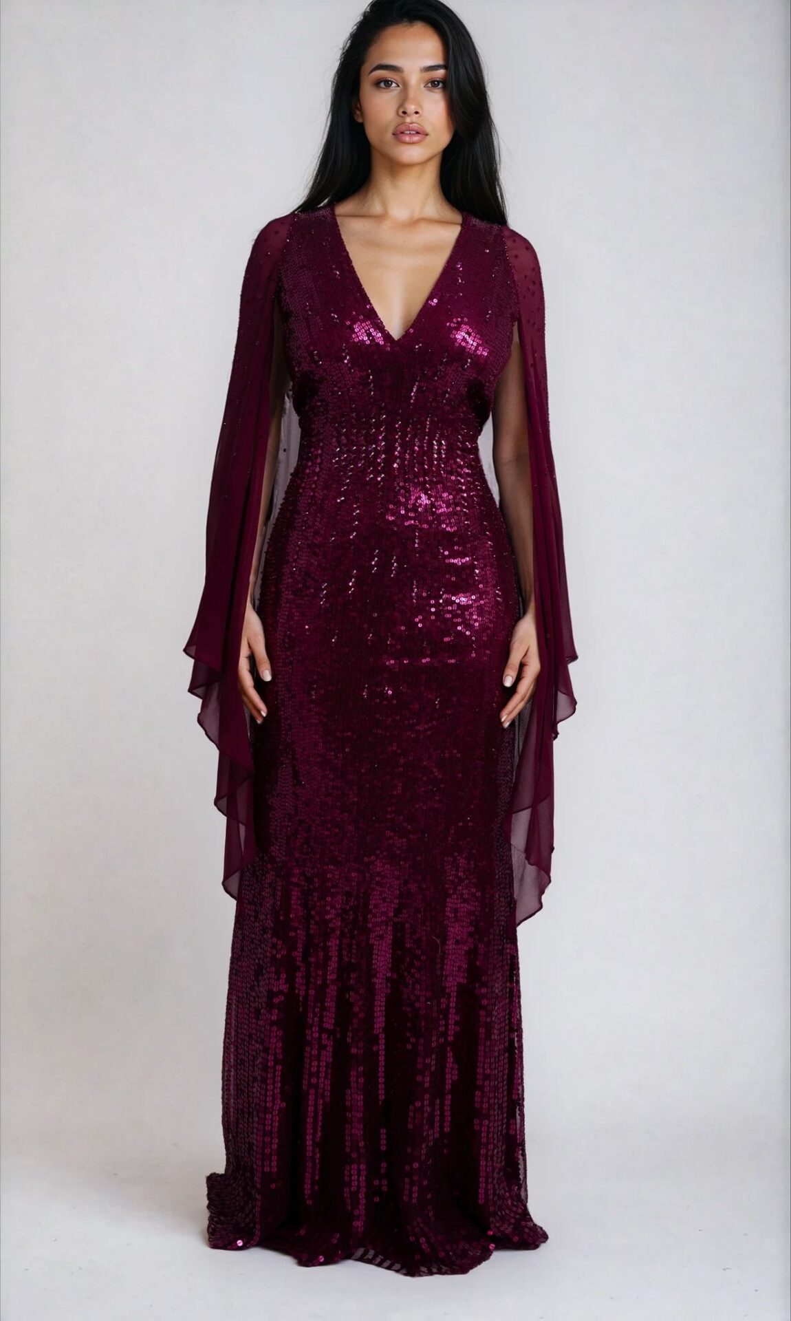 Dieses Abendkleid verbindet glamourösen Paillettenbesatz mit fließenden Capeärmeln für einen dramatischen Auftritt. Das figurbetonte Oberteil mit tiefem V-Ausschnitt schmeichelt dem Dekolleté, während die Taille sanft betont und der lange Rock in Maxilänge elegant nach unten ausläuft.