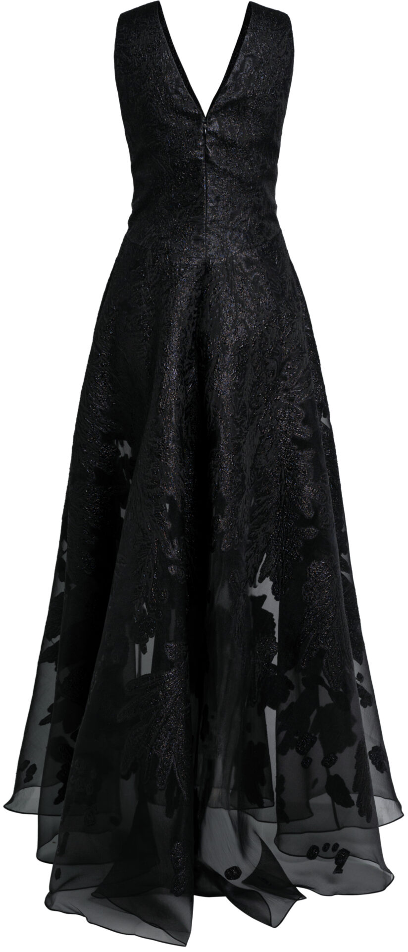 Dieses Abendkleid verbindet eine klare, moderne Linienführung mit opulenter Textur. Das ärmellose Oberteil mit tiefem V-Ausschnitt formt eine schmale, definierte Taille und geht in einen weit schwingenden Rock über. Der strukturierte Oberstoff ist dezent glänzend und mit einem tonalen, leicht erhabenen Muster gearbeitet, das dem Kleid Tiefe und Raffinesse verleiht.