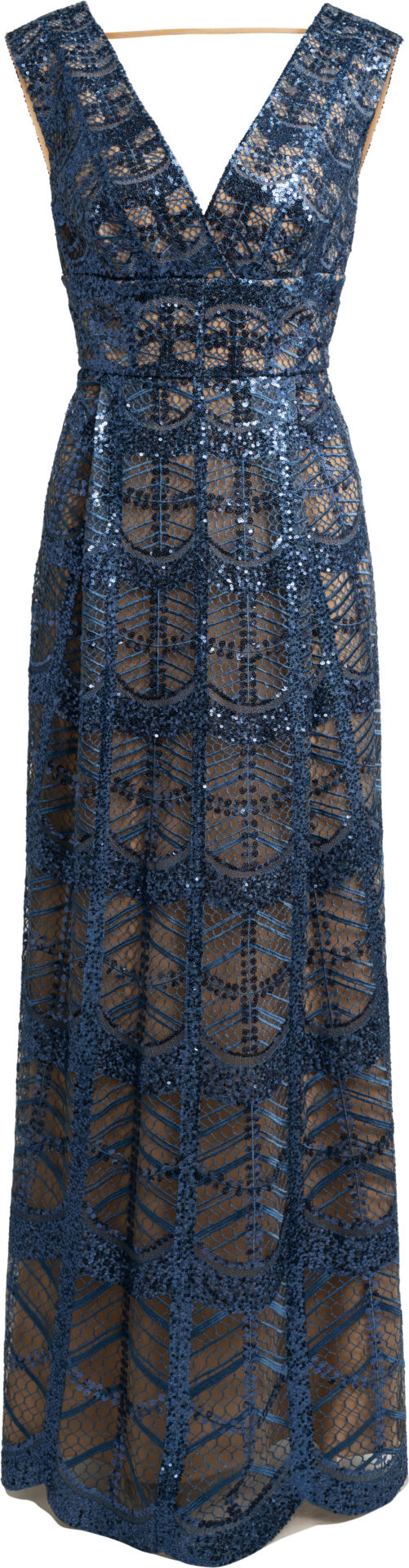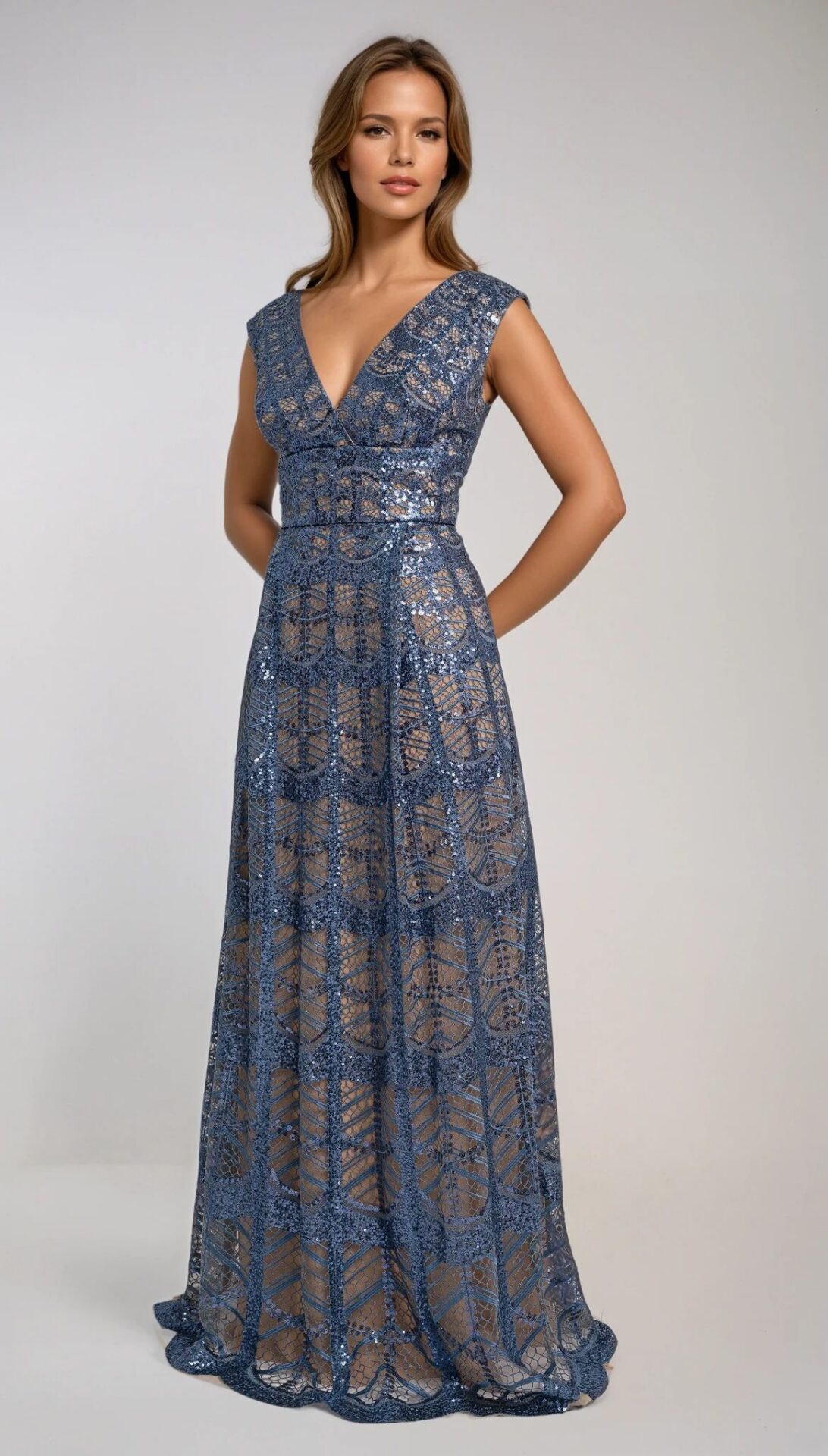 Dieses edle Abendkleid vereint aufwendige Spitzenstickerei mit einem luxuriösen Paillettenfinish, das bei jeder Bewegung glanzvolle Reflexe erzeugt. Der tiefe V-Ausschnitt sorgt für eine elegante, elongierende Wirkung und setzt das Dekolleté stilvoll in Szene. Die leicht strukturierte Taillenpartie formt eine feminine Silhouette und leitet harmonisch in den bodenlangen Rock über.