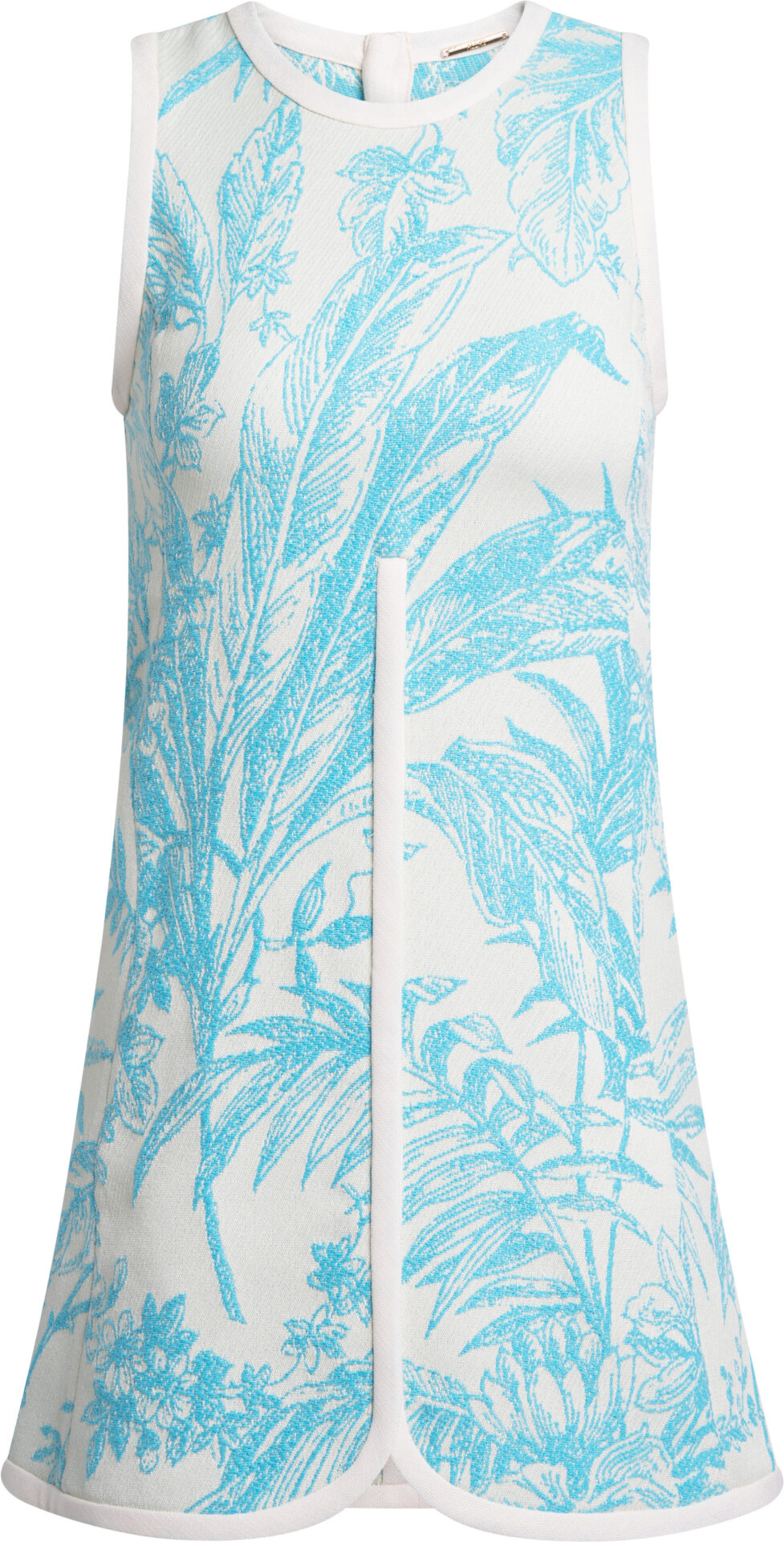 Dieses ärmellose Mini-Kleid verbindet klare Linien mit einem frischen, botanisch inspirierten Allover-Print in Türkis auf Off-White. Die kompakte Silhouette wirkt modern und feminin, während die kontrastierenden Einfassungen den Look präzise rahmen und ihm eine hochwertige Kontur geben.
