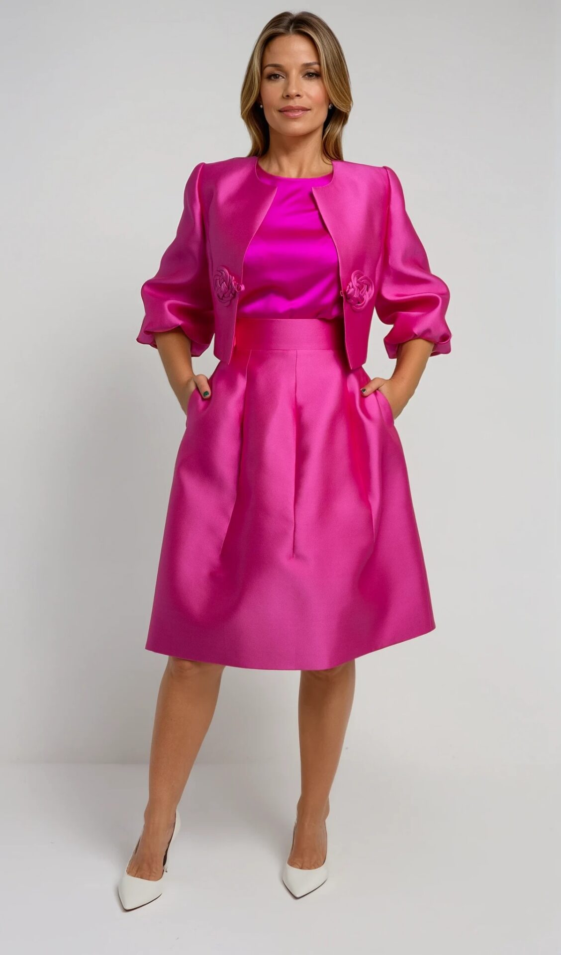 Diese ausdrucksstarke Cropped-Jacke in leuchtendem Pink/Fuchsia ist ein elegantes Statement-Piece für besondere Anlässe. Die glänzende Satin-Optik verleiht dem Modell eine luxuriöse Präsenz, während die strukturierte Silhouette für einen modernen Couture-inspirierten Look sorgt. Die Materialkomposition aus 37% Seide und 63% Polyester verbindet edle Ausstrahlung mit formschöner Stabilität.
