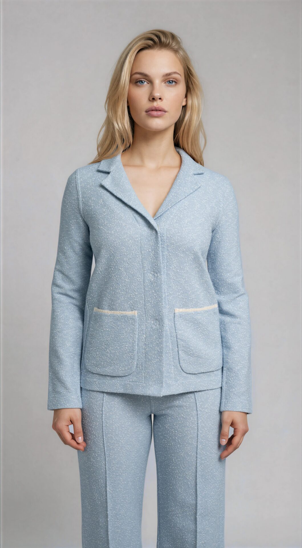 Aufgesetzte Taschen setzen einen stilvollen, funktionalen Akzent, während subtile Kontrastdetails an den Taschenabschlüssen das Design veredeln, ohne es zu überladen. Die leicht verlängerte Form betont die Figur auf elegante Weise und eignet sich ideal für Layering – über Blusen, feinen Tops oder als Set-Piece zu passenden Unterteilen.