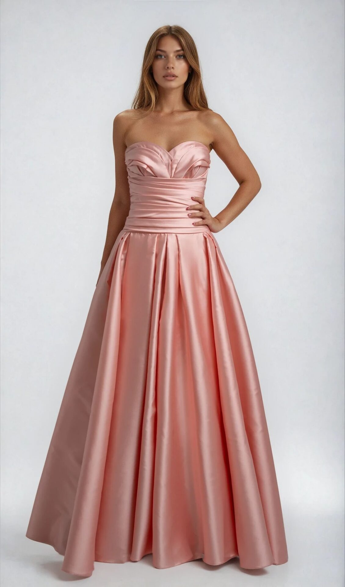 Dieses bodenlange Bustierkleid in zartem Rosé verbindet zeitlose Red-Carpet-Eleganz mit moderner Schnittkunst. Das trägerlose Oberteil ist kunstvoll drapiert und formt ein feminines Dekolleté, während die breite Taillenpartie die Silhouette definiert und optisch streckt.
