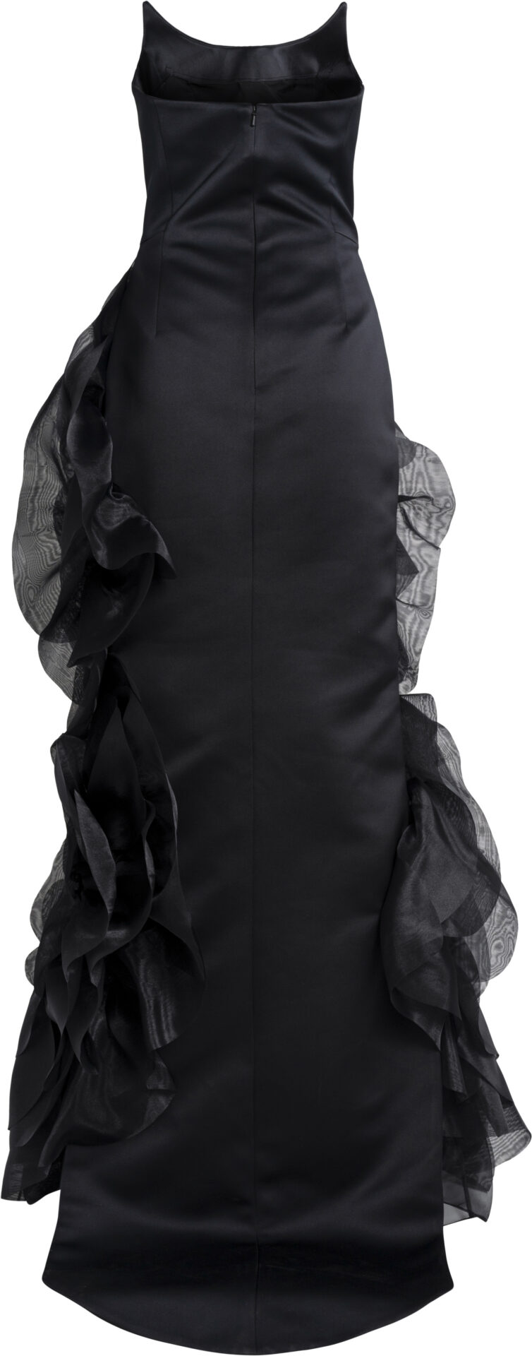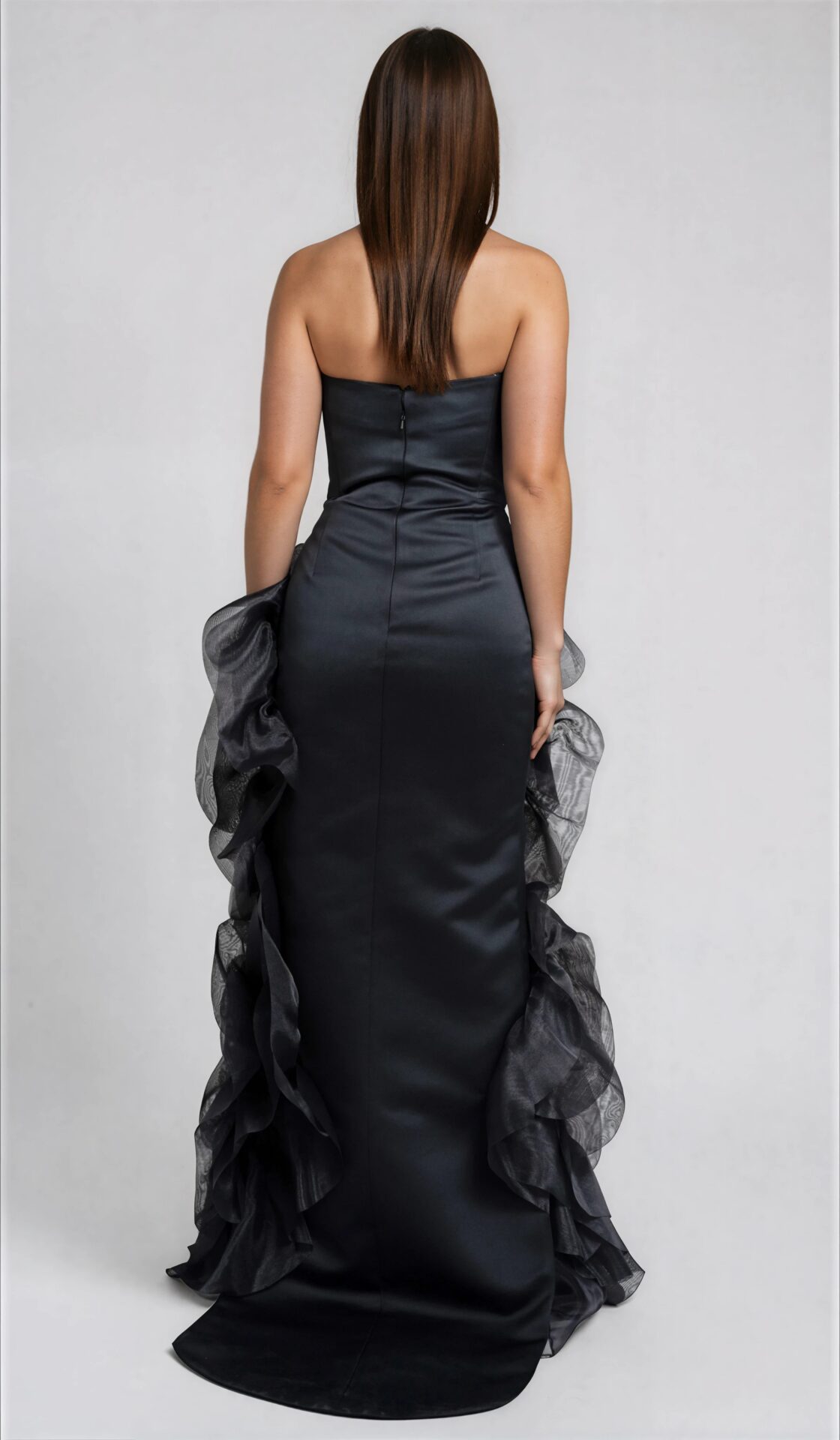 Besonderes Highlight ist die großflächige, florale Applikation aus transparent wirkenden Volants, die sich plastisch über Vorderseite und Rockpartie legt. Die dreidimensionale Verarbeitung verleiht dem Kleid eine dramatische Bewegung und macht es zur idealen Wahl für Gala-Abende, Red-Carpet-Momente und exklusive Evening Events mit hoher modischer Aussagekraf
