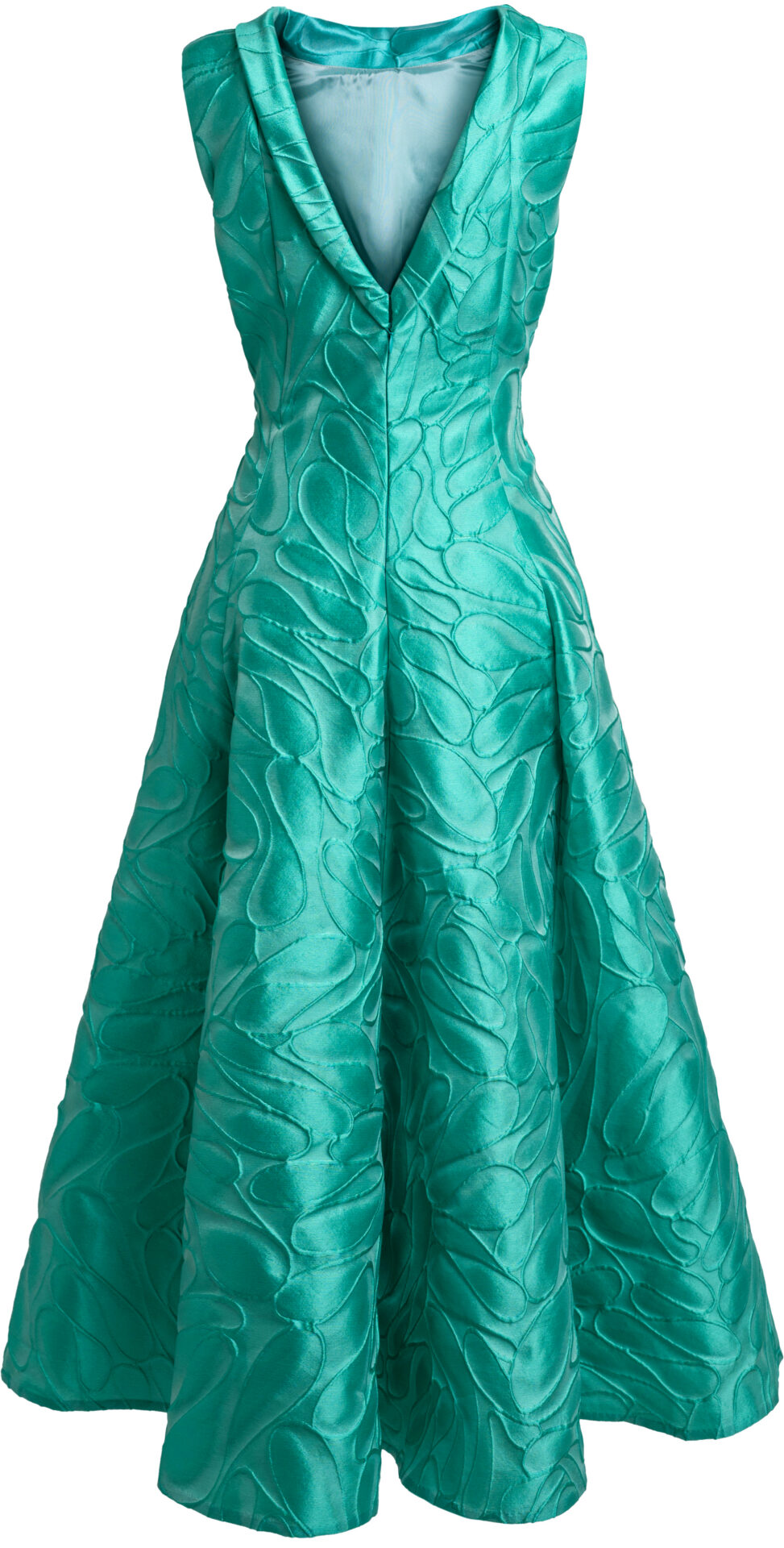 Dieses Midikleid in leuchtendem Türkis setzt auf pure Eleganz mit architektonischer Wirkung: Der strukturierte Jacquard mit softem Glanz verleiht dem Look Tiefe, während das taillierte Oberteil die Silhouette präzise definiert. Der V-Ausschnitt mit breiter Blende wirkt modern und rahmt das Dekolleté stilvoll ein.