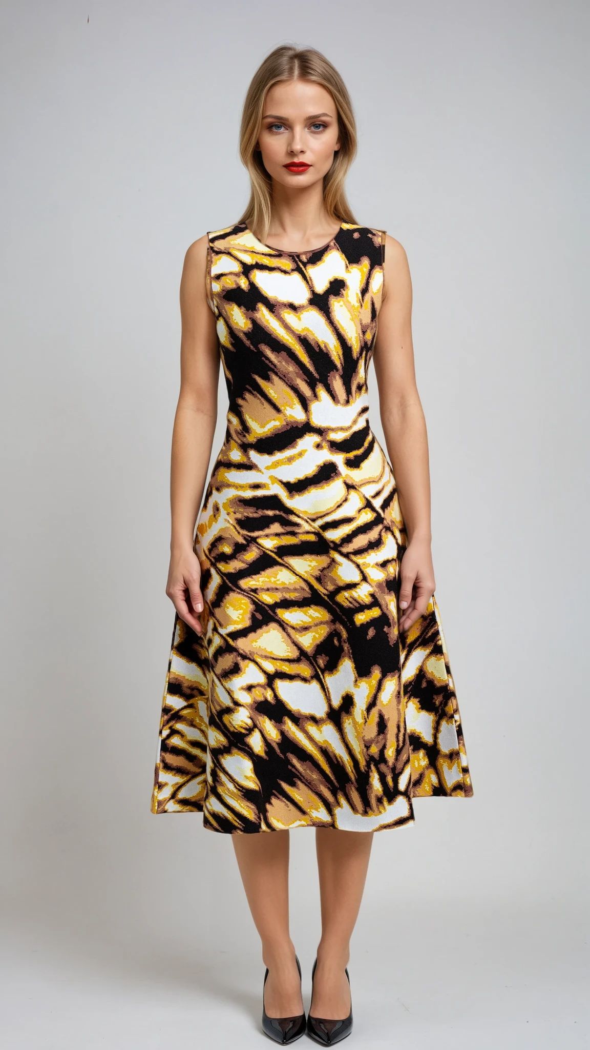 Kniebedeckendes, ausgestelltes Strickkleid mit ornamentalem Musterprint