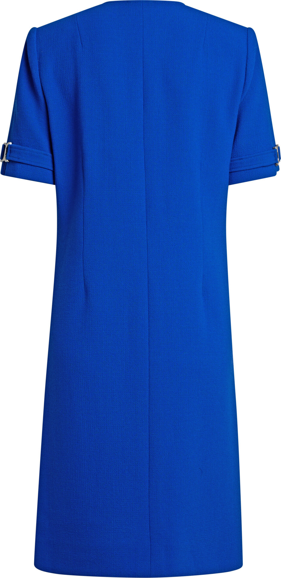 Dieses Kleid setzt auf eine klare, modern-elegante Silhouette und präzise Schneiderdetails. Der runde Ausschnitt und die gerade Linienführung wirken puristisch, während aufgesetzte Pattentaschen mit dekorativen Metall-Elementen und Ärmelriegeln einen subtilen Akzent setzen. Der verdeckte Frontverschluss sorgt für ein ruhiges Gesamtbild – perfekt für Business, Dinner oder Events mit Dresscode.