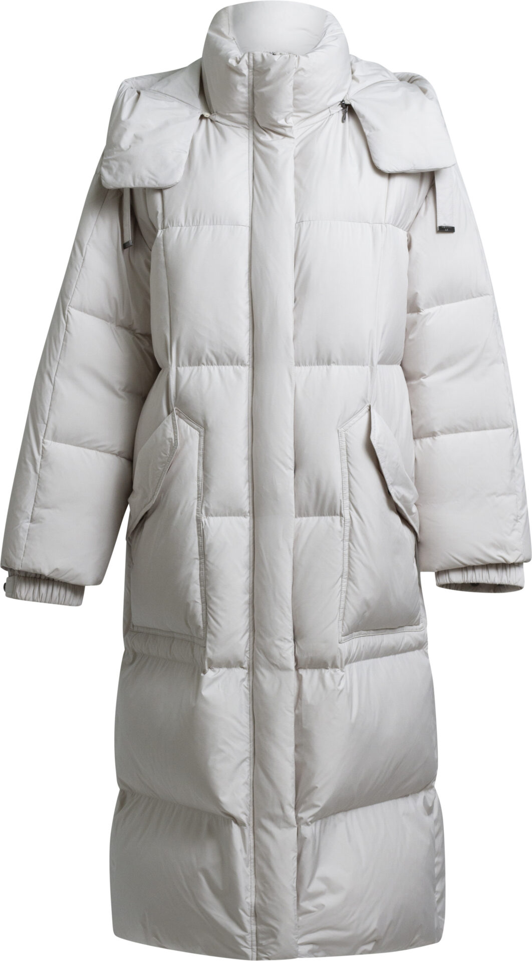 Langer Daunenmantel mit Kapuze und aufgesetzten Taschen