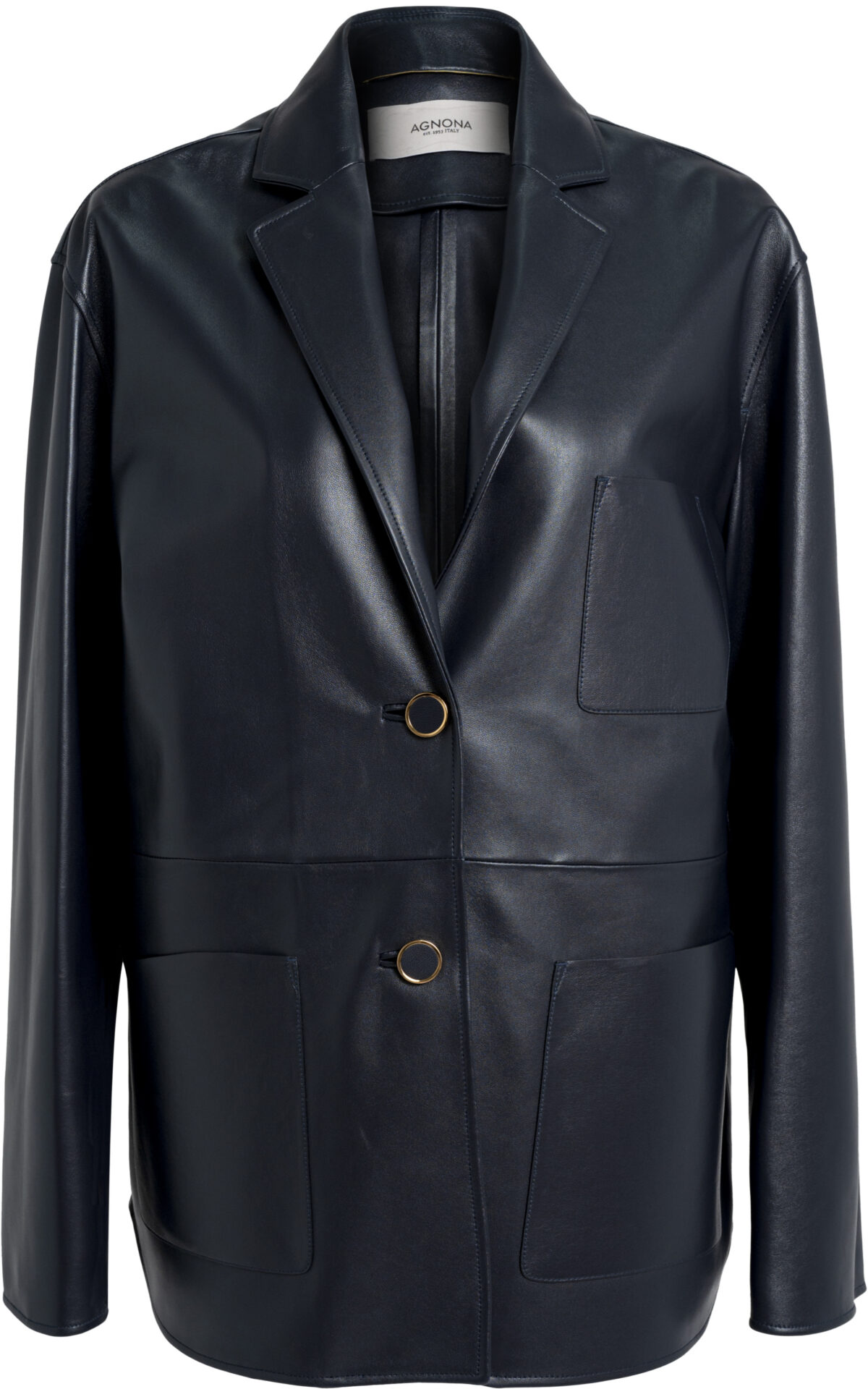 Diese Lederjacke interpretiert den klassischen Blazer in einer modernen, entspannten Silhouette. Der leicht oversized Schnitt und das klare Revers verleihen dem Look eine souveräne, zeitlose Ausstrahlung – ideal für stilvolle Layering-Momente.