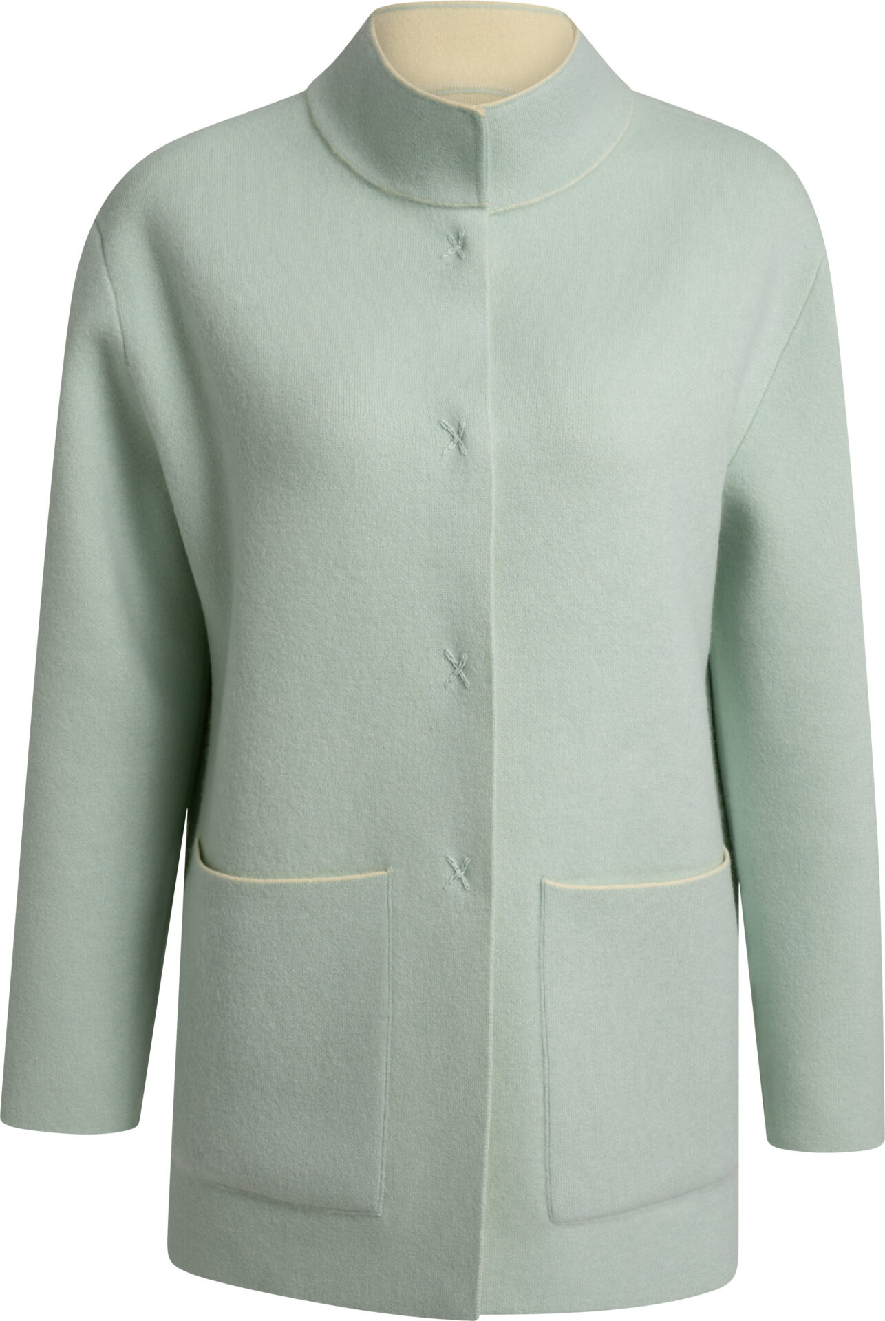 Je nach Stimmung wechseln Sie zwischen zartem Pastellgelb und sanftem Mint. Der klare Stehkragen unterstreicht die puristische Linie, während die großzügigen aufgesetzten Taschen dem Look eine lässige Note geben. Feine Kantenakzente setzen ein dezentes Highlight und betonen die hochwertige Verarbeitung des reversible Designs.
