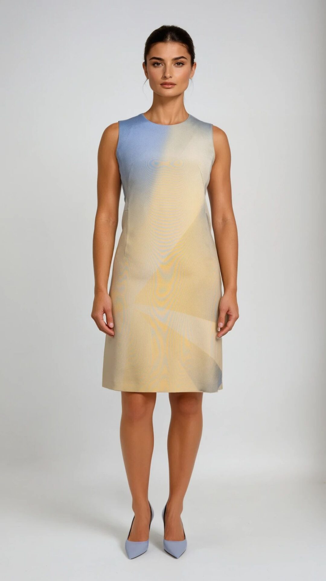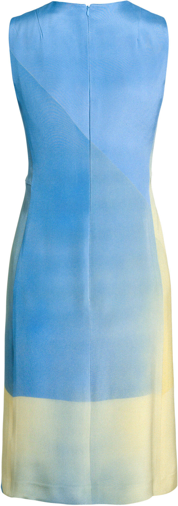 Dieses ärmellose Kleid aus reiner Seide überzeugt mit einem fließenden Fall und einer klaren, femininen Silhouette. Der Rundhalsausschnitt und die leicht taillierte Form unterstreichen die schmale Linie, ohne einzuengen. Das raffinierte, weich verlaufende Dessin mit grafisch angelegten Partien verleiht dem Kleid eine moderne, künstlerische Ausstrahlung.