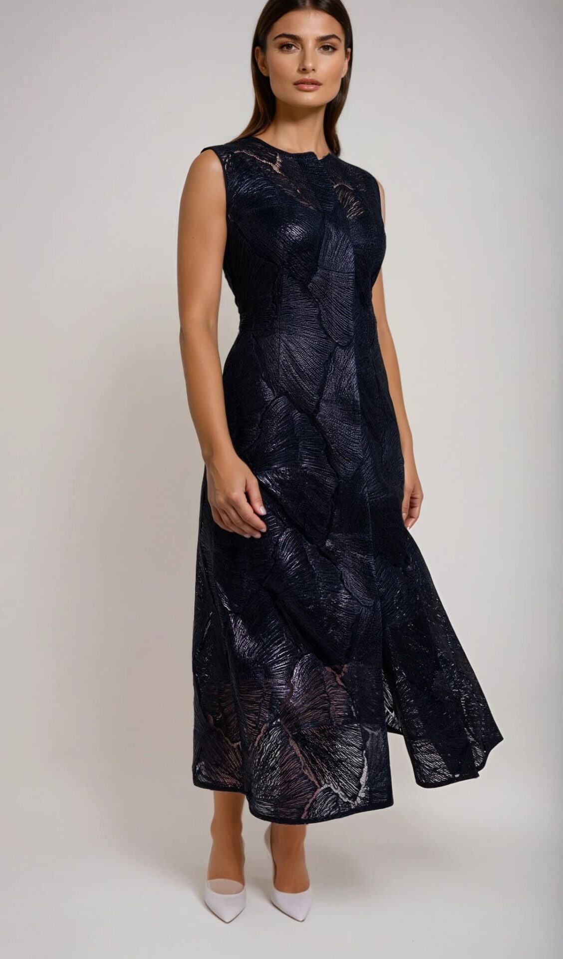 Dieses ärmellose Kleid besticht durch seine aufwendig strukturierte Oberfläche und den halbtransparenten Charakter. Das Material zeigt eine tonige, reliefartige Zeichnung, die an organische Blätter erinnert und dem Modell eine couture-inspirierte Tiefe verleiht. Der Rundhalsausschnitt und die dezente, vorne verlaufende Blende betonen die klar vertikale Linie und strecken die Silhouette.