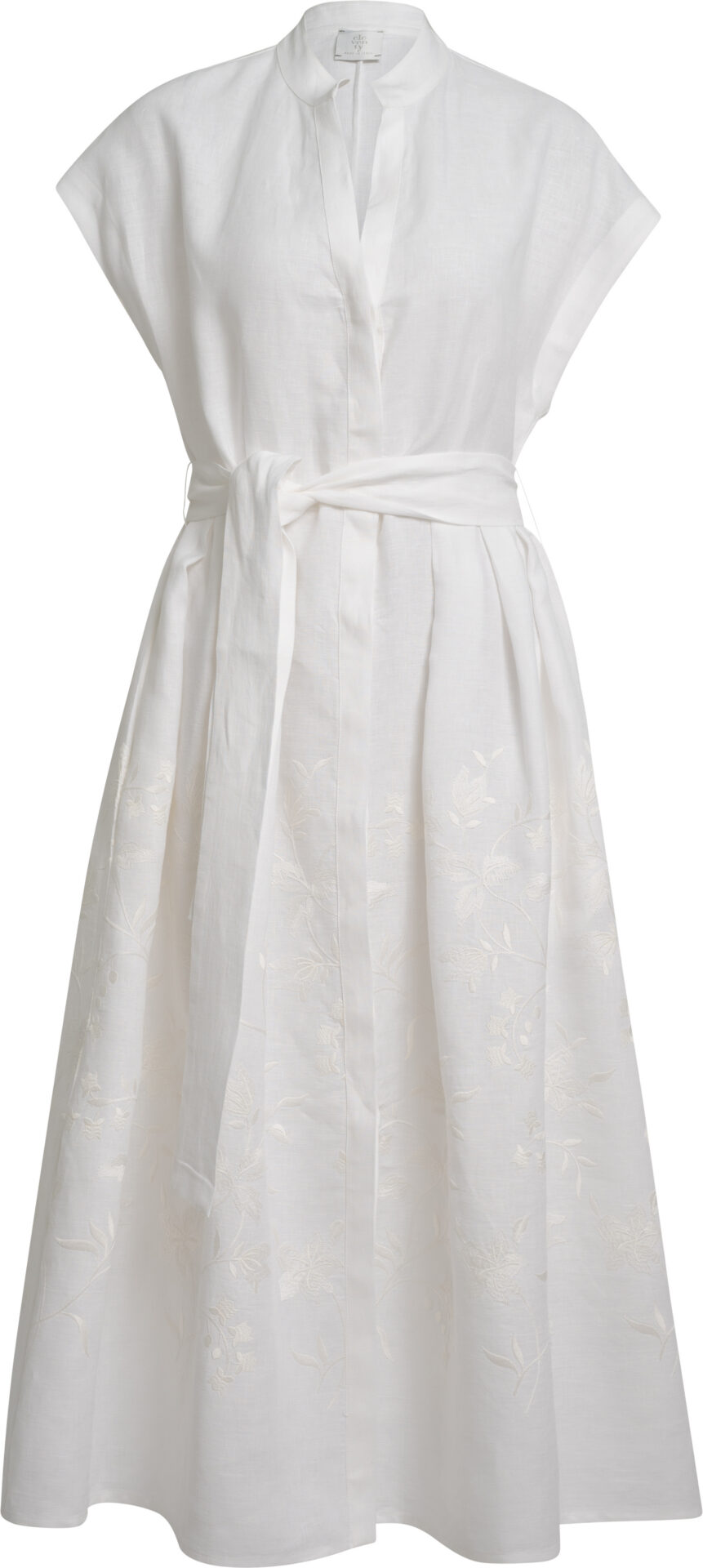 Weißes Leinen-Hemdblusenkleid mit Bindegürtel und Ton-in-Ton Stickerei